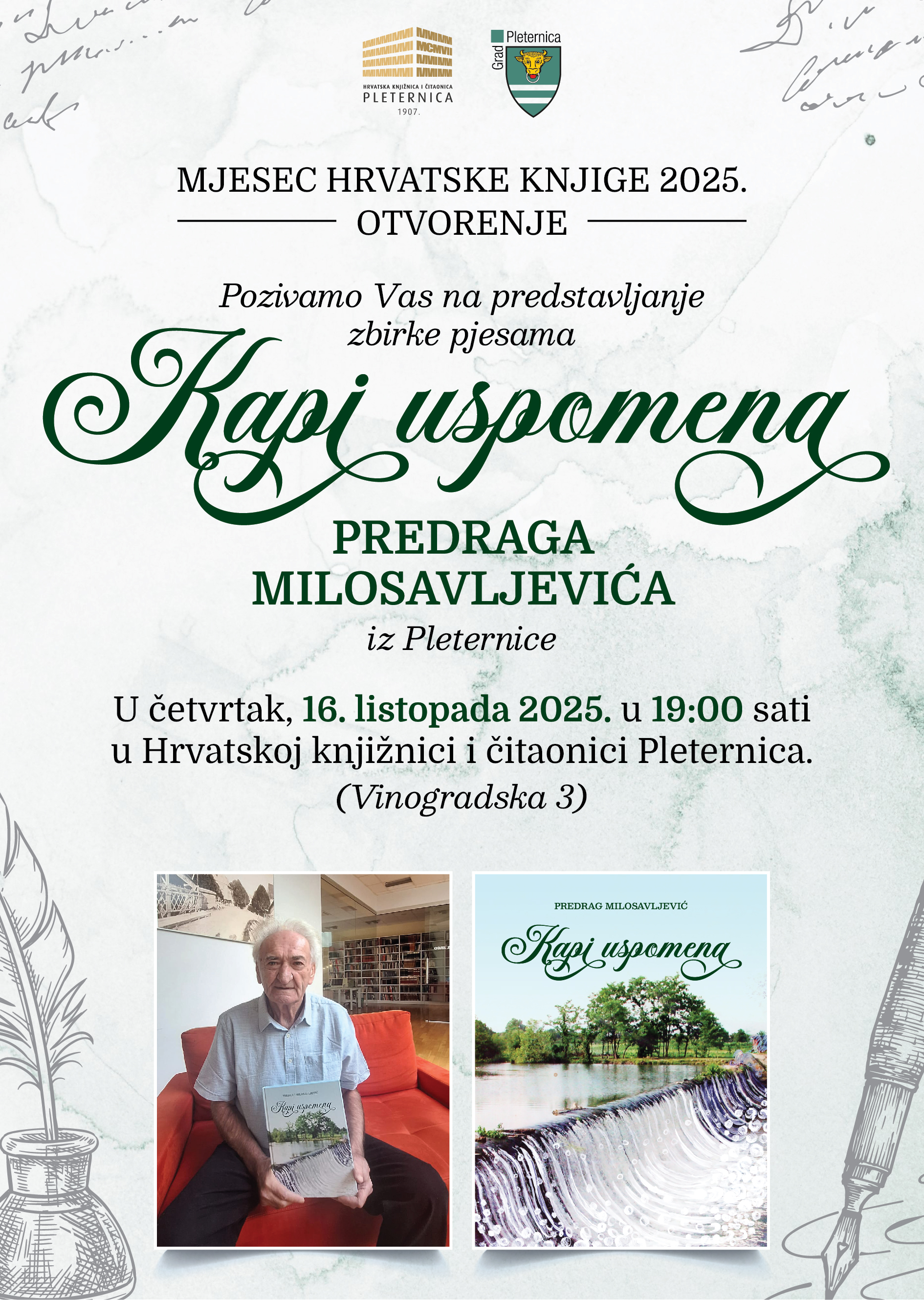 Na otvorenju „Mjeseca hrvatske knjige“ u prepunoj dvorani Hrvatske knjižnice i čitaonice u Pleternici održano je predstavljanje zbirke pjesama "Kapi uspomena" autora Predraga Milosavljevića iz Bresnice. Predstavljajući njegov životopis, ravnatelj Knjižnice prof. Franjo Novak istaknuo je kako autor još od djetinjstva piše poeziju i priče za svoju dušu, a svojim pjesmama izražava ljubav i domoljublje prema svom zavičaju i ljudima oko sebe. Pjesme su objavljene putem društvenih mreža i naišle su na dobre kritike, što je bio poticaj za javno objavljivanje. Predrag je jedan od inicijatora i osnivača Udruge „Branko Drinovac-Lega“ iz Bresnice, čiji je i danas aktivni član.